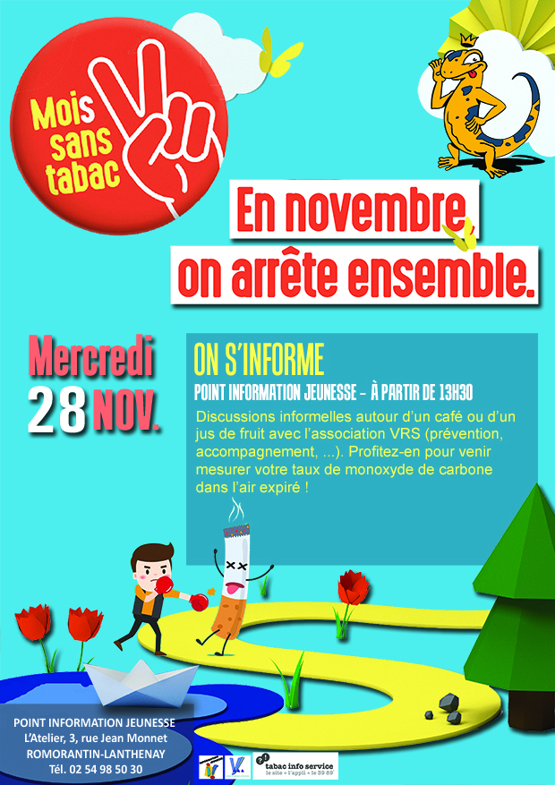 Mais surtout vous pouvez venir nous voir le Mercredi 28 Novembre au Point Information Jeunesse à partir de 13h30 pour rencontrer une professionnelle de l’association VRS « Vers un Réseau de Soin » (prévention, accompagnement) et discuter autour d’un café ou d’un jus de fruit. Vous pourrez également en profiter pour faire le point et tester votre taux de monoxyde de carbone.